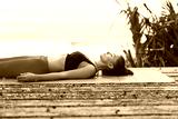 Corpse Pose Young athletic woman in black sport bra, red pants doing yoga exercises in front of sea