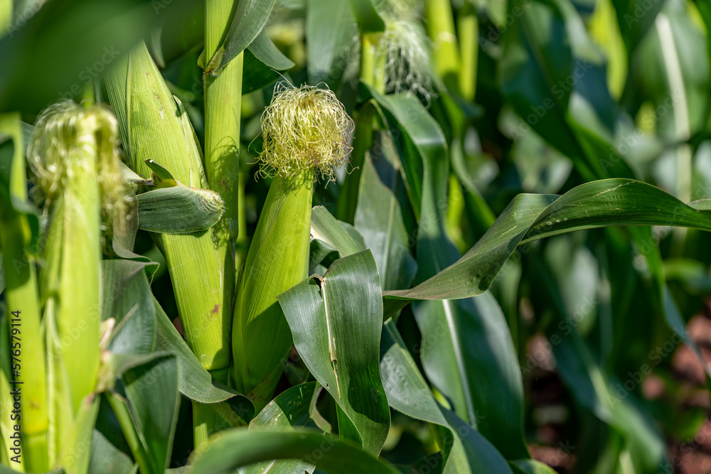 Sweet corn and green leaves at Corn field in organic corn smart farm with sun sky background.