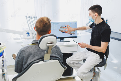 A young dentist doctor tells a male patient about dental care. A man was sitting in a dental chair at a doctor's appointment. Modern dental treatment