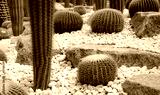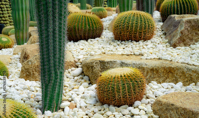 Cactus garden. Green cactus tree. Desert plant. Elephant cactus and golden barrel cactus in the garden. Desert plant. Cacti succulent plants. Sharp golden thorn on plant. Stem succulent with spines.