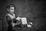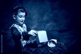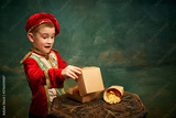 Happy cheerful little boy wearing costume of medieval page boy and prince eating hamburger with french fries over dark green background.