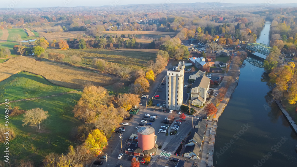 Large corn and wheat farms surrounding riverside Village of Pittsford is the oldest town in New York, incorporated in 1827 with historic Schoen Place