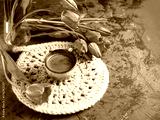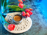 A cup of coffee on the table with a bouquet of red tulips. breakfast on women's day
