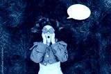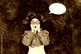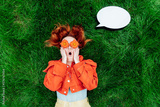 Wow. Emotional surprised, shocked redhead woman with red orange gerbera Flower glasses and blank mockup thoughts cloud on green grass. Positive Emotion. Fashion. Selective focus, copy space.