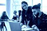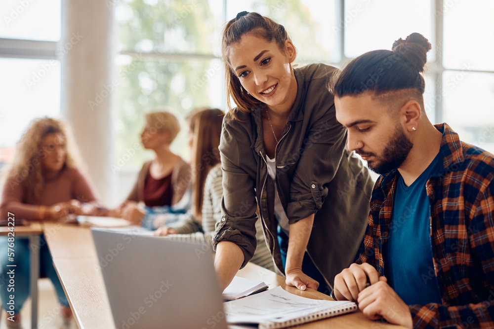 Happy college classmates using laptop while studying together in classroom.