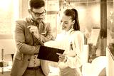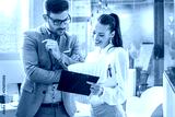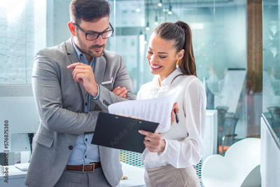 Attractive young smiling business secretary bringing report releases to her chief showing good corporate development results.