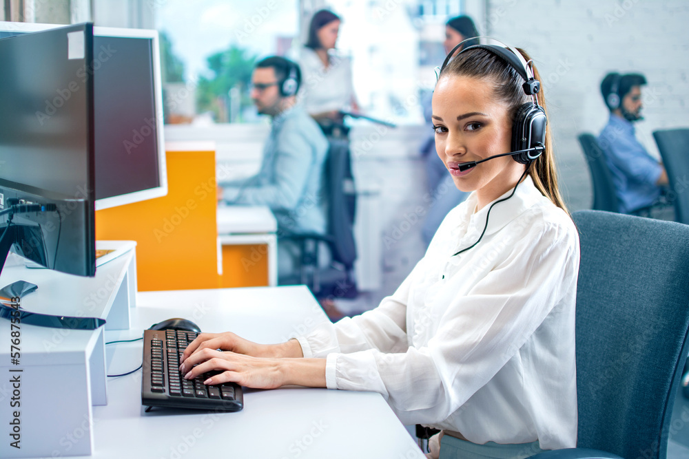 Portrait of female IT sector operator with headset working on computer and looking at camera in call center office.