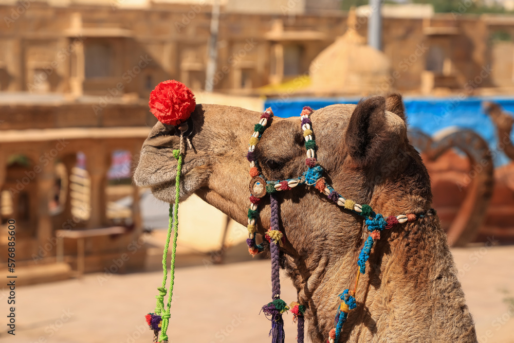 Decorated camel close up view at the Jaisalmer- Rajasthan, India