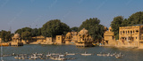 Panoramic view of artistically carved historic temples and shrines around The Lake Gadisar Jaisalmer.India.