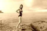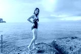 Sexy asian woman Wear a black body suit. Standing on the rock in the sea