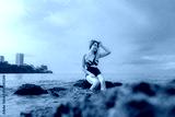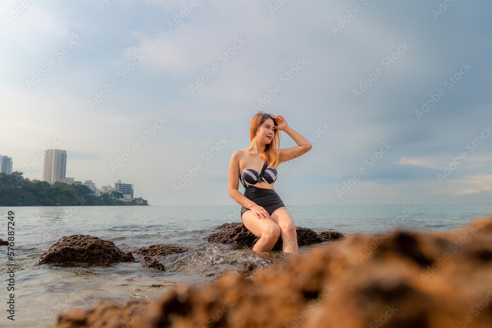 Sexy asian woman Wear a black body suit. Sitting on a rock in the sea
