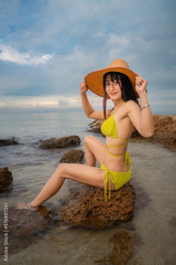 Sexy asian woman Wear a yellow body suit. Sitting on a rock in the sea