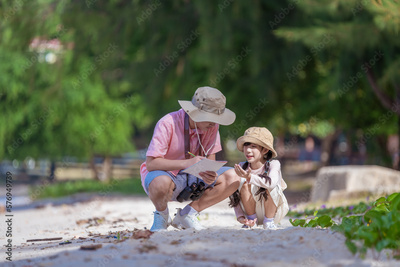Children on ecotourist trip and used binoculars learning show beach take care of environment is summer holiday camp save earth save world day concept.