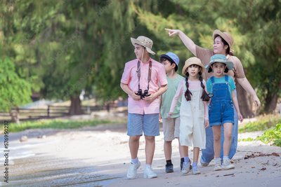 Group of teacher and school children on ecotourist trip and used binoculars learning show beach take care of environment is summer holiday camp save earth save world day concept.