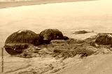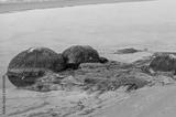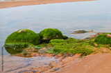 Green algae covered boulders at sea coast beach. Rocks covered with green seaweed in sea water.