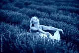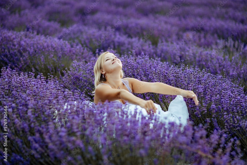 A middle-aged woman sits in a lavender field and enjoys aromatherapy. Aromatherapy concept, lavender oil, photo session in lavender