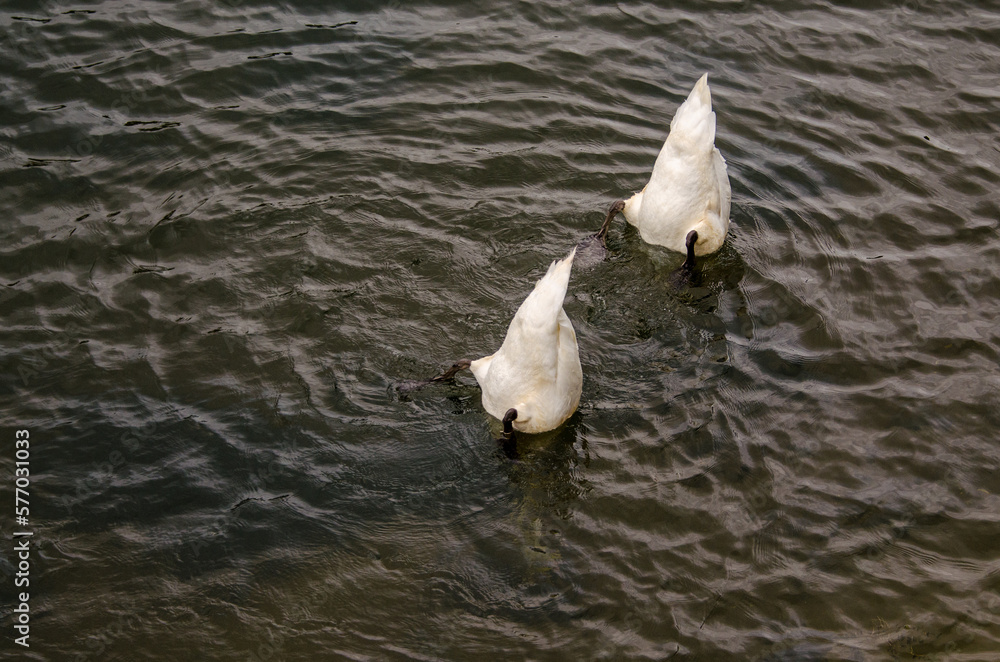 swans head dipping in the water