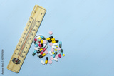 Thermometer with medicine. The concept of temperature changes affecting health.