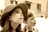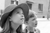 Two elementary school age girls Caucasian European kids outdoors, summer portrait, face closeup, sun hat, children on vacation holidays real people lifestyle. Sisters, siblings, close friends together
