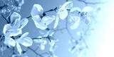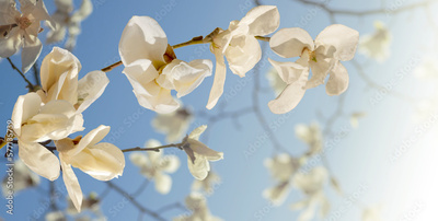Magnolia bloom in spring against the sky. Branches with Large white Magnolia grandiflora flowers close-up view