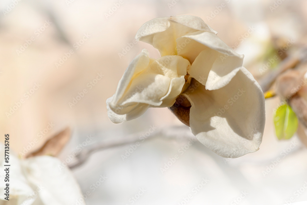 Magnolia bloom in spring against the sky. Branches with Large white Magnolia grandiflora flowers close-up view