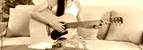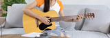 Asian female artist playing the guitar and singing happily in the living room, Relaxation with music therapy, Spending free time with music, Joy of playing music, Acoustic guitar.