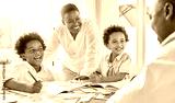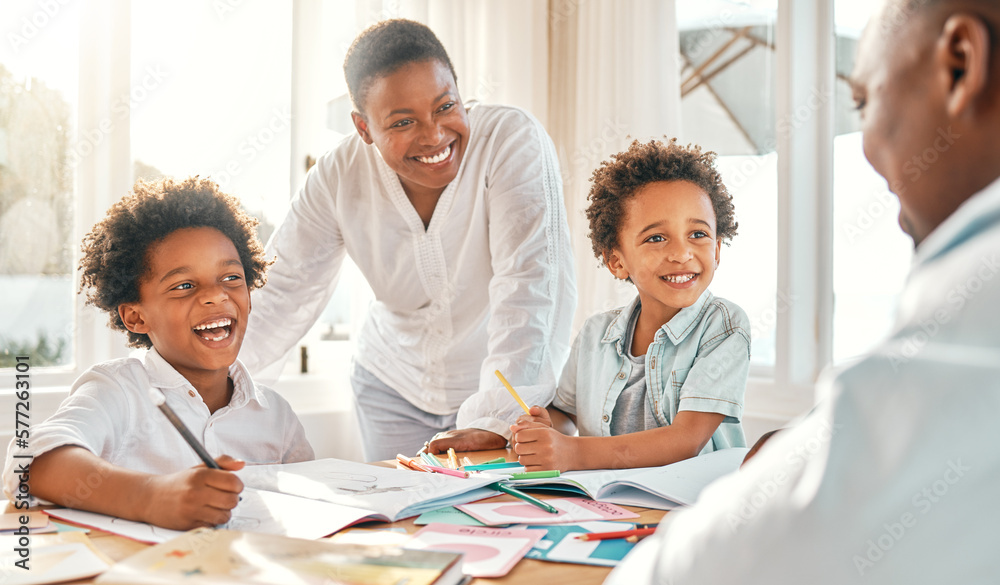 Homework, education and school with a black family learning together in their home for child development. Kids, writing or books with children and parents in their house to study for growth