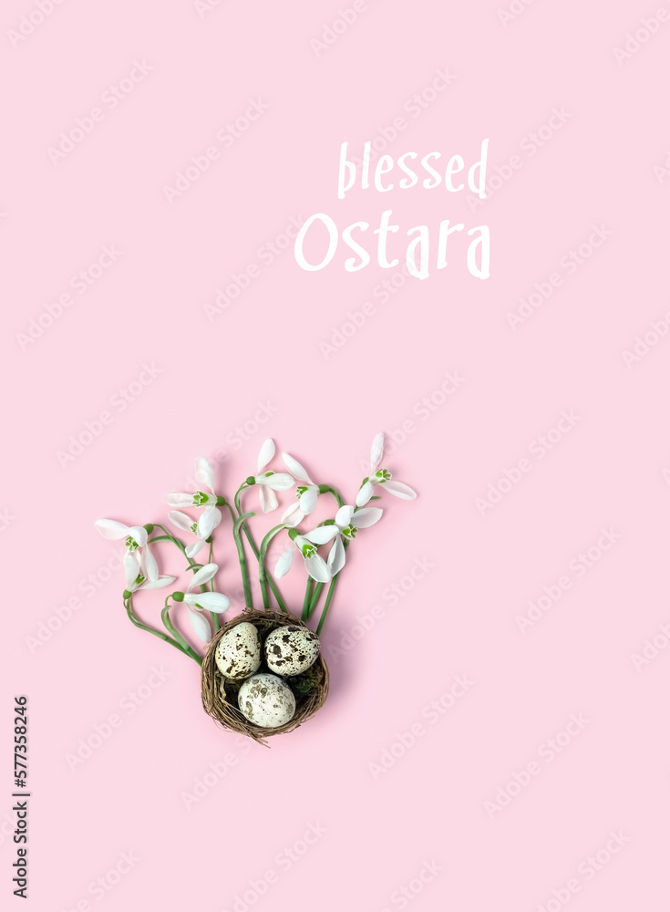 Blessed Ostara greeting card. Snowdrop flowers and eggs in nest on abstract pink background. symbol of Easter holiday, wiccan Ostara sabbat. spring festival decor. flat lay. minimal style