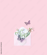 snowdrop flowers in paper envelope and butterfly on abstract pink background. Symbol of spring season, 8 march holiday. minimal style. flat lay. copy space. template for design