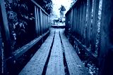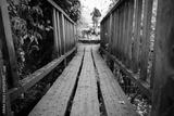 Near surface level view of a metal studded river crossing in a famous nature reserve. A woman and her dog have just crossed the bridge.