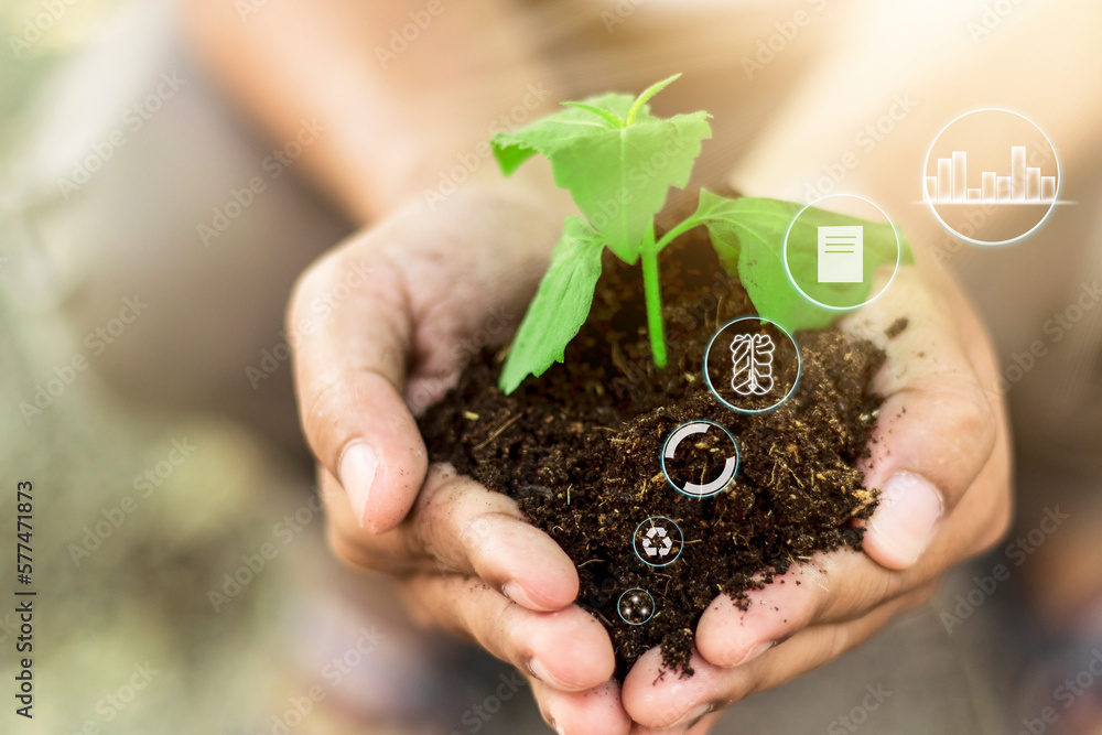 hand touching planting small plants with holographic soil environmental science with new future technology business planning development and conservation protection