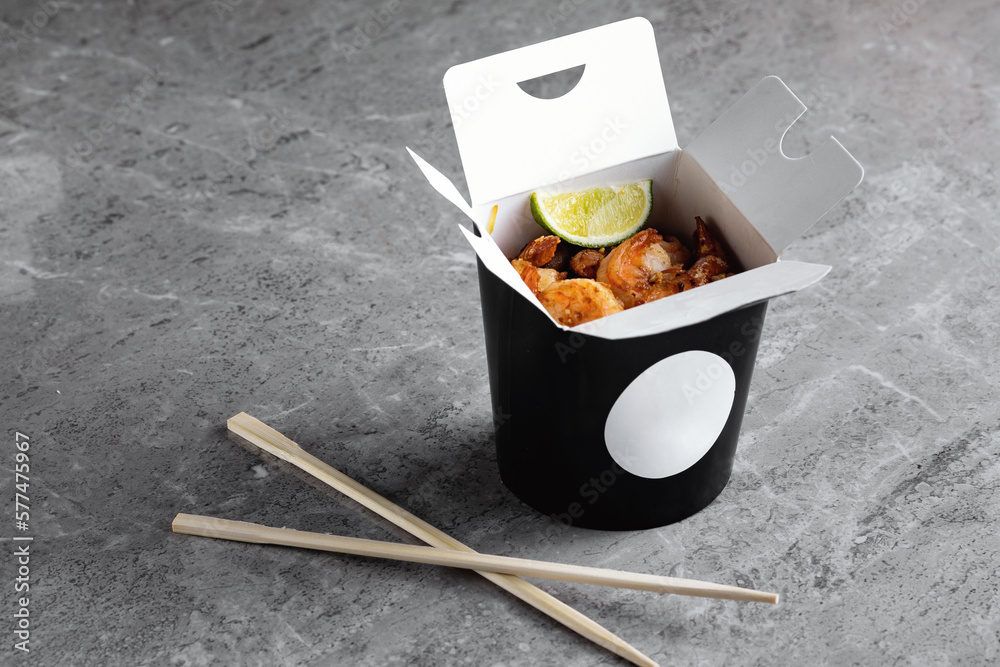 Chinese food in a black takeout box on a gray background. Sushi chopsticks and a black box.