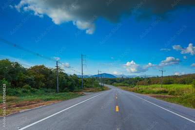 beautiful road and mountain scenery in thailand,Asphalt road through the green field and clouds on blue sky in summer day. Beautiful grassland road in Thailand.Highland road.
