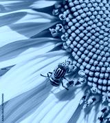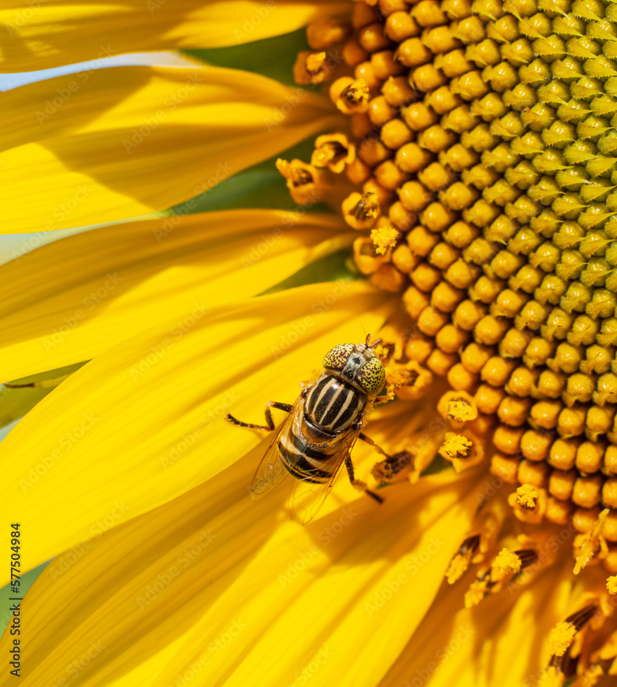 Bee sucking sunflower nectar,Bees suck nectar on sunflowers. A group of bees forage or nectar on pollen. Beautiful blooming yellow sunflowers in a field on a white cloudy sky background with copy spac