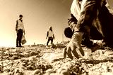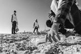 Volunteer man's hand with gloves picking up plastic rubbish from the beach to clean the sand together with his fellow activists Recycling concept. High quality photo