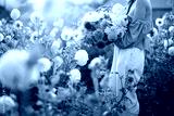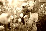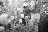 Woman holds lush bouquet of colorful freshly picked up dahlias on rural flower farm on sunset. Cropped view with no face