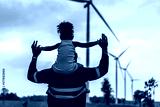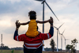 Black african father engineer holds his daughter in his arms at the wind turbines with great freedom. Concept of environmental engineering, renewable energy and love for nature and for the family