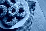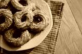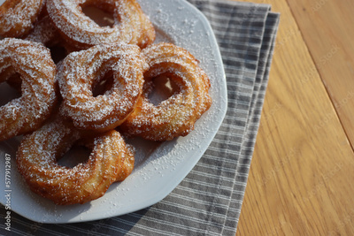 Top view of fried Zeppole with cinnamon and powdered sugar. Neapolitan homemade sweet pastry on white plate on table