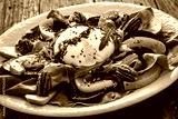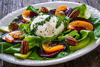 Burrata cheese with roasted beets, greens, peaches and pecan nuts on wooden table