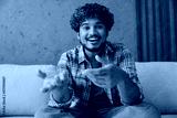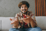 Web cam view head shot close up Indian man wears casual clothes spread hands get video call talk use pc laptop sits on sofa couch stay home flat rest relax spend free spare time in living room indoor.