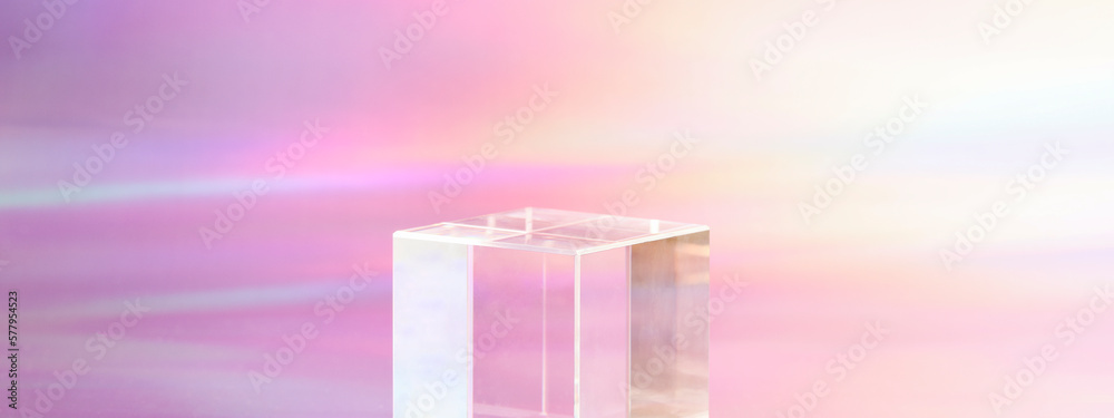 transparent podium for product display on holographic, neon background. pedestal, stage for product. copy space. selective focus banner