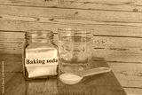baking soda and glass of water on wooden table.
