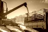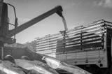 Combine harvester emptying harvested corn into tractor trailer.Corn fields and dry fields,Harvest and corn planter concepts.