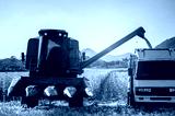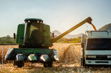 Combine harvester emptying harvested corn into tractor trailer.Corn fields and dry fields,Harvest and corn planter concepts.