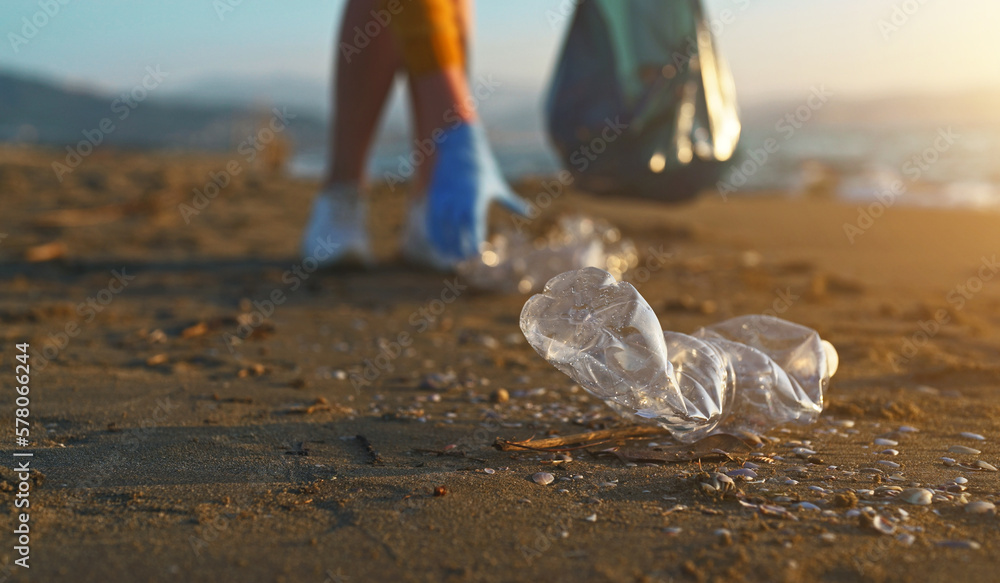 Woman volunteer collects garbage on the beach. Environmental pollution.