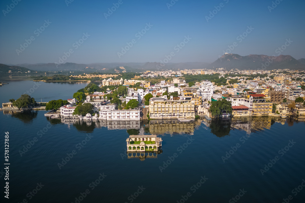 Aerial view of historic Udaipur cityscape along lake Pichola