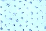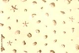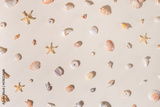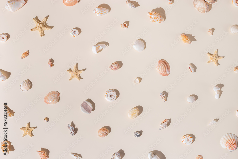 Seashells and starfish with shadows on beige pastel background at sunlight. Summer vacation concept. Nautical pattern. Minimal flat lay with natural shells, sea stars, stones, sea life theme