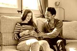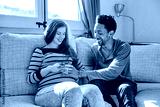 Happy pregnant couple holding their hands on belly while expecting baby.