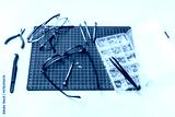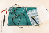 kit for repairing used eyeglasses on wooden table