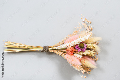 top view of tied bouquet of dried flowers and spikelets lies on gray background